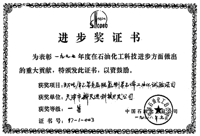 1998年9月,新天进公司与辽宁某石化公司签定合同,进行其10万吨/年苯乙烯精馏系统粗苯乙烯和精苯乙烯塔内件设计及制造,并于98年11月通过中石化集团公司组织的专家评审(评审会照片、现场评审照片、评委名单、评审意见)。99年12月一次开车成功。