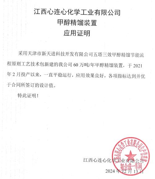 九江心连心化肥有限公司60万吨/年甲醇装置采用天津市新天进科技开发有限公司自主知识产权工艺技术——五塔双三效甲醇精馏工艺方法 ,蒸汽单耗低至0.6吨蒸汽/吨精甲醇。